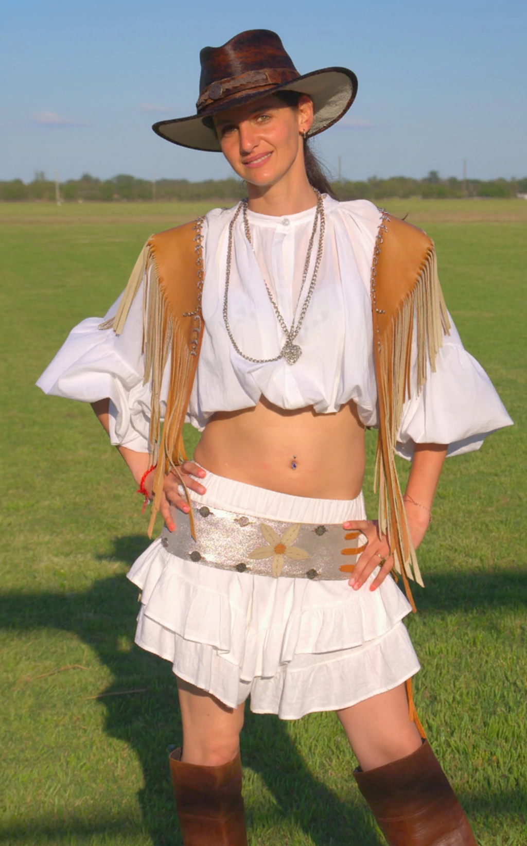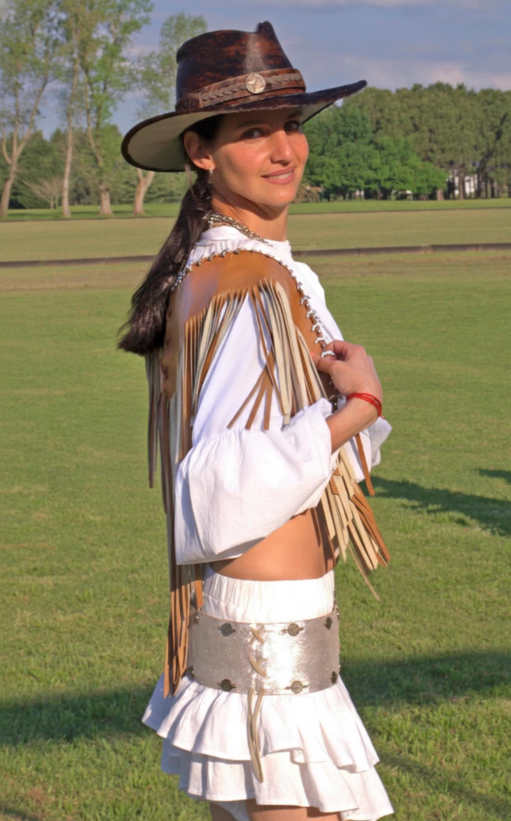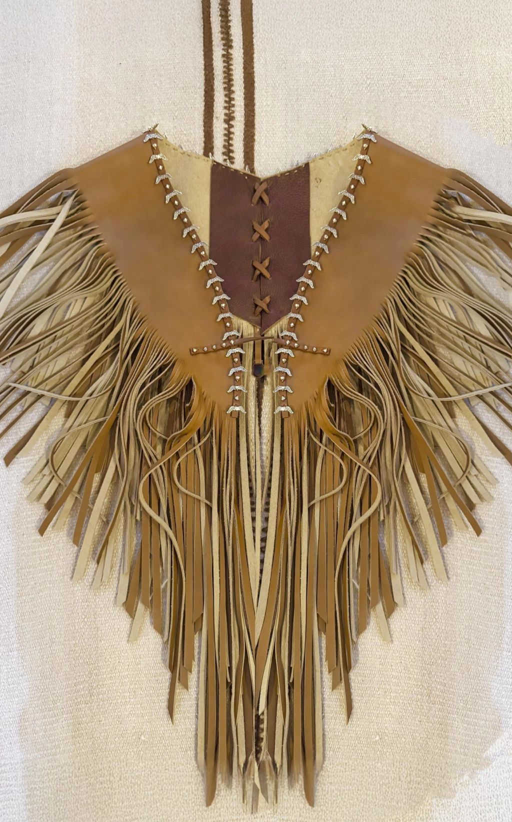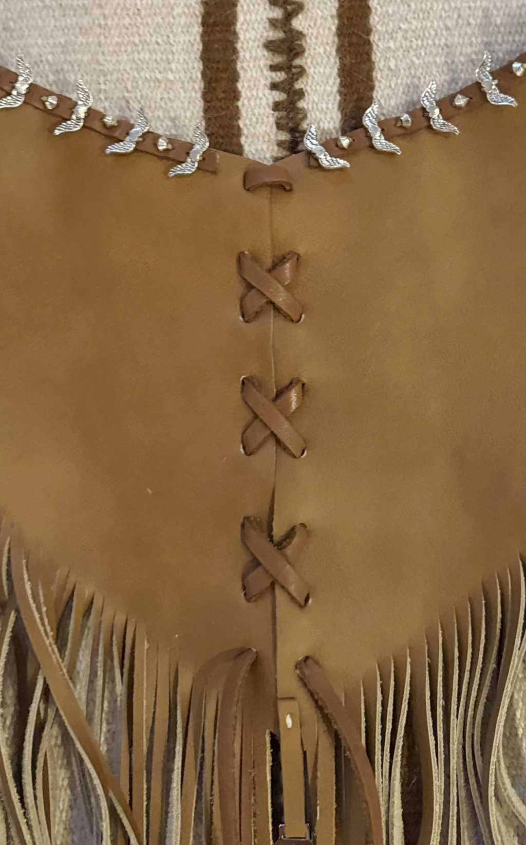 Esta realizada en cuero genuino, cada uno de sus flecos es cortado a mano, para completar su silueta triangular.
