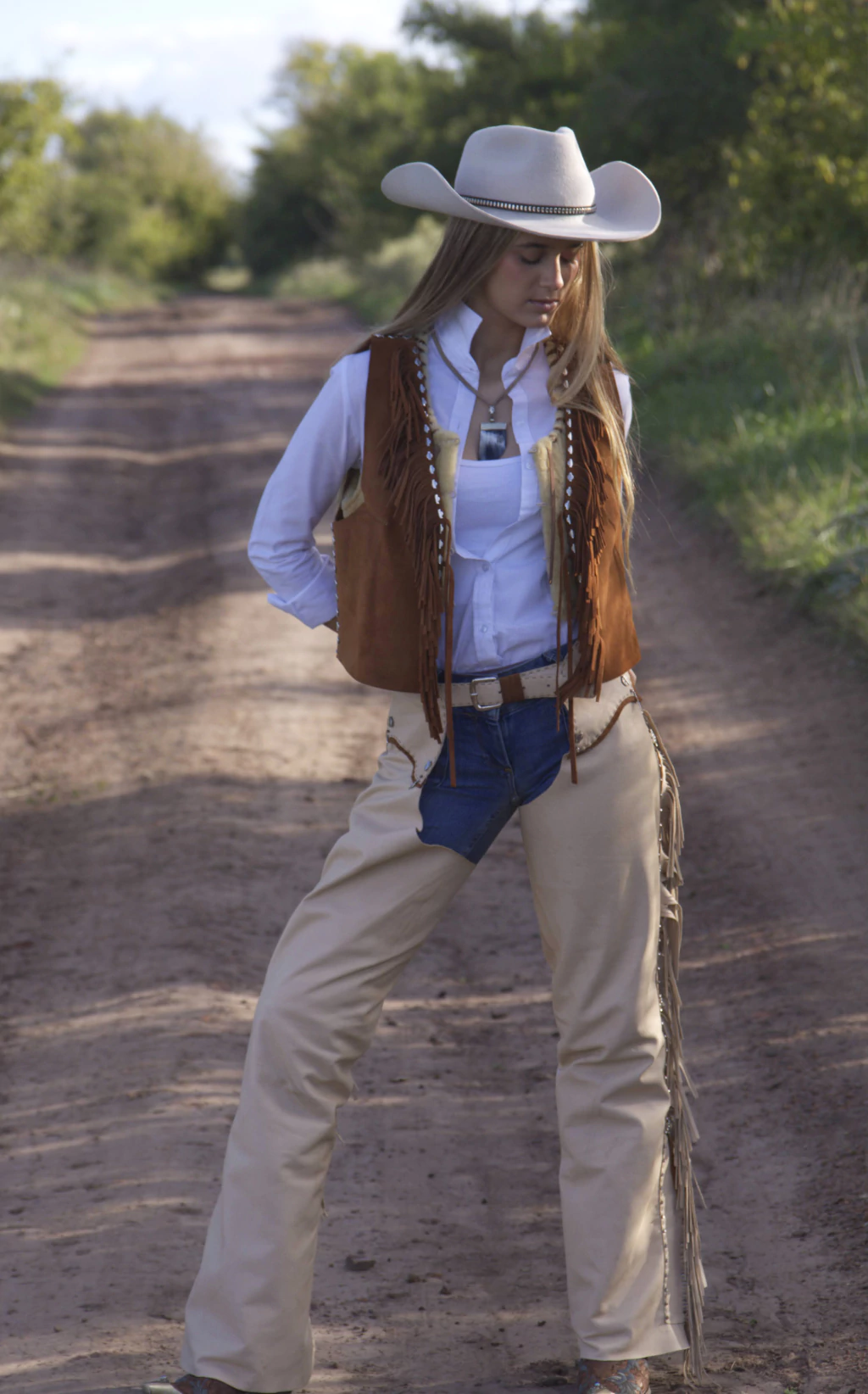 Su cintura regulable con hebilla se adapta perfectamente a vos, mientras que los flecos laterales aportan movimiento y personalidad. Además, las chaparreras están finamente bordadas a mano con cuentas metálicas, un trabajo artesanal que las hace exclusivas.