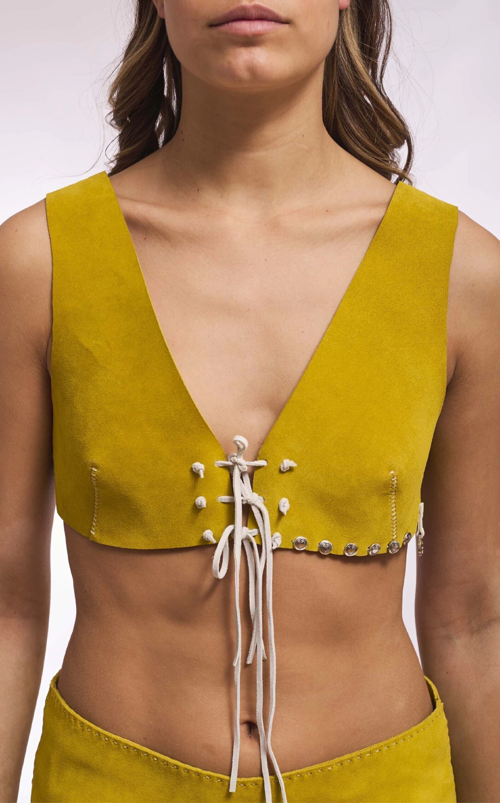 El Top Fun Lima está confeccionado completamente a mano en gamuza seleccionada, con ajuste de tiento en frente y espalda, lo que garantiza el mejor calce y comodidad. Cuenta con pinzas de entalle en busto.